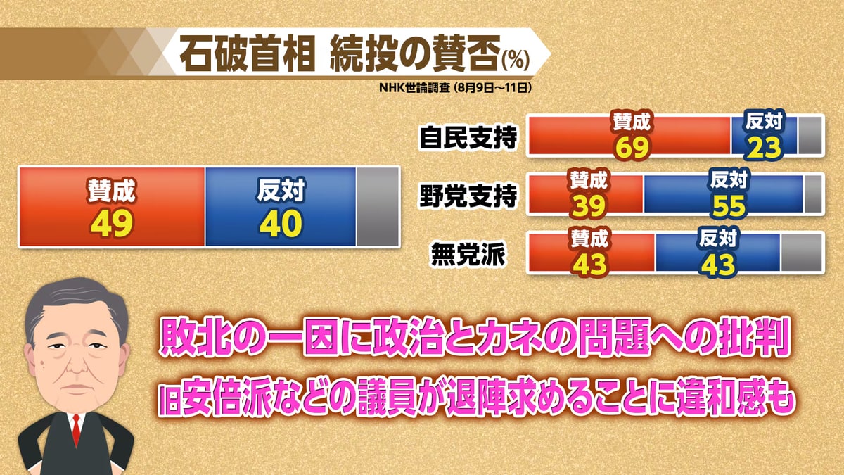 参考記事を見ると、NHKの8月調査で石破茂首相の続投賛成が49%、反対40%だって報じたけど。